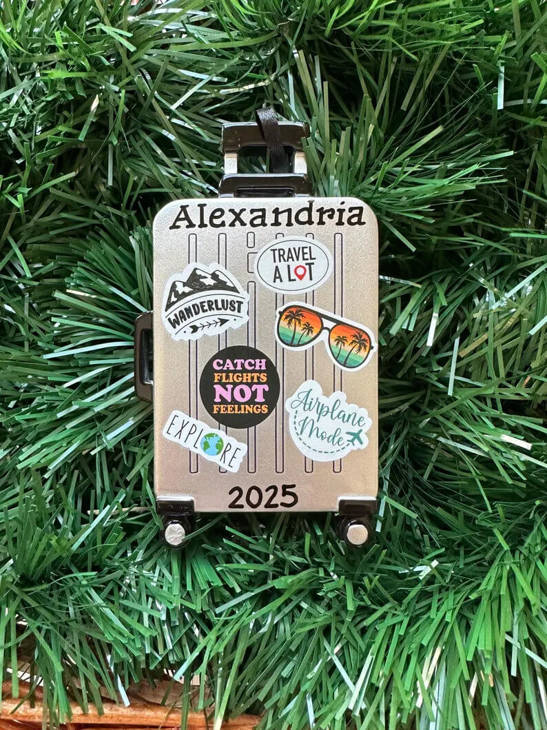 - This customizable suitcase ornament
